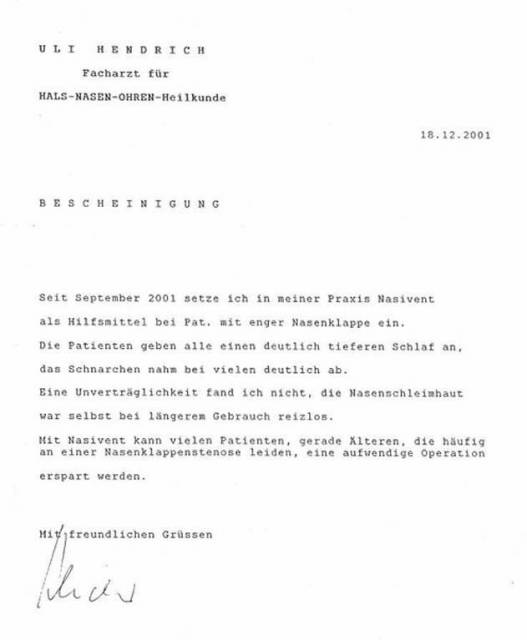 Médico Especialista en Oido Nariz y Garganta (Otorrinolaringologo) Dr. Med. Uli Hendrich http://www.arztscout.com/de/ (sitio web) Dr Med. Uli Hendrich) 18-12-2001 He estado usando Nasivent como asistencia médica en mi práctica desde septiembre, en especial con los pacientes que tienen tienen dificultados en el paso nasal, y en la respiración. Todos los pacientes indicaron que dormían más profundamente y que el ronquido se redujo definitivamente para muchos de ellos. No provoco ninguna irritación. No hubo problemas con la mucosa nasal, incluso con el uso prolongado. Con Nasivent una gran cantidad de pacientes, incluyendo los mayores, que sufren de un pasaje nasal estrecho, han podido eviter una operación. Le saluda atentamente, [firmado] |