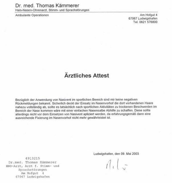 Dr. Med. Thomas Kämmerer Declaración médica No he recibido informes negativos sobre el uso de NasiVent en el deporte. Obviamente, los pelos nasales son presionados casi completamente plano cuando se utiliza, y estos son en realidad destinados a permanecer seco durante las actividades deportivas. Esta situación se puede evitar mediante la aplicación de una pomada nasal simple para el área de piel suave dentro de la nariz. Ludwigshafen, 09 May 2003 |